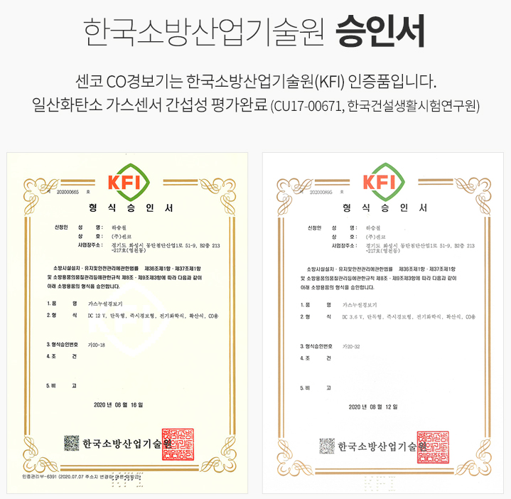 한국소방안전기술원(KFI)의 형식승인을 받은 제품이어야 합니다.